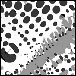 Backscattered electrons have high energy, and their abundance is determined by the average atomic number of the spot that the beam is hitting. The higher the average atomic number, the larger the fields associated with the nuclei of the atoms. The larger the Coulombic fields, the more likely a beam electron will interact with it and produce a backscattered electron. Therefore, mapping the abundance of backscattered electrons will provide us with information about the composition of the sample. In the backscattered electron image to the right, one can see three phases, each with a very different backscattered electron signal. The round or oval shaped dark grains have the lowest average atomic number, and the white matrix has the highest average atomic number. From this image we can determine the area occupied by each phase without doing any chemical analyses. |